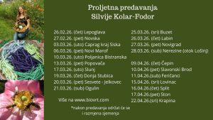Posjetit ćemo 22 mjesta/grada u Hrvatskoj i održati besplatna predavanja na teme: “Bioraznolikost u akciji: Ključne taktike za zaštitu vašeg vrta od napasnika”, “Kako imati vlastitu hranu dostupnu cijele godine”, “Sjeme kao zalog naše budućnosti” i “Vrtlarenje u skladu s prirodom” te razmjene sjemenja. U sklopu predavanja održati će se i predstavljanje istoimene knjige “Vrtlarenje u skladu s prirodom” autorice i predavačice Silvije Kolar-Fodor.